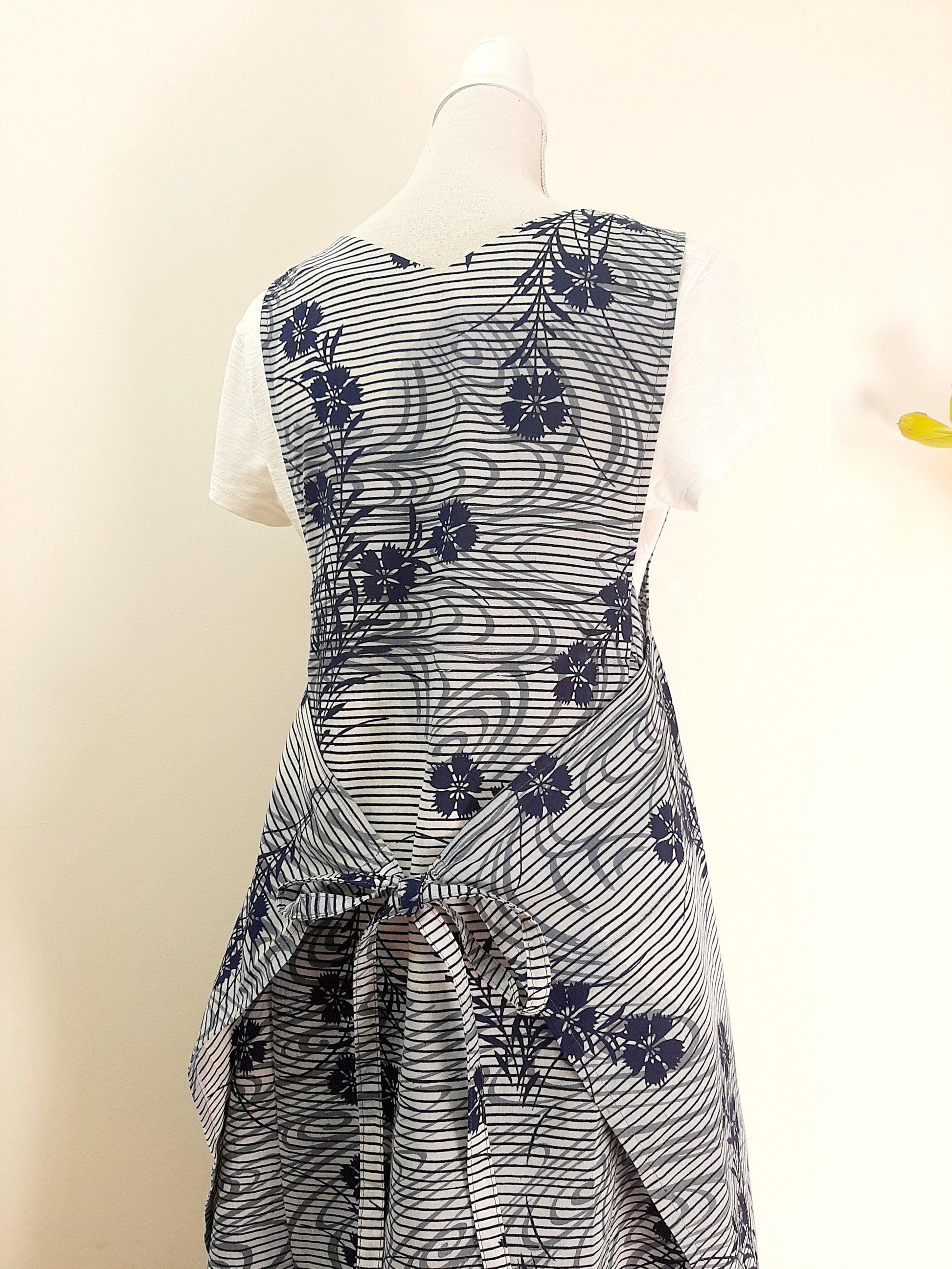 This butterfly/apron style dress is made from a beautiful cotton kimono with lovely flower pattern. The background colour is grey and flower pattern is navy blue.