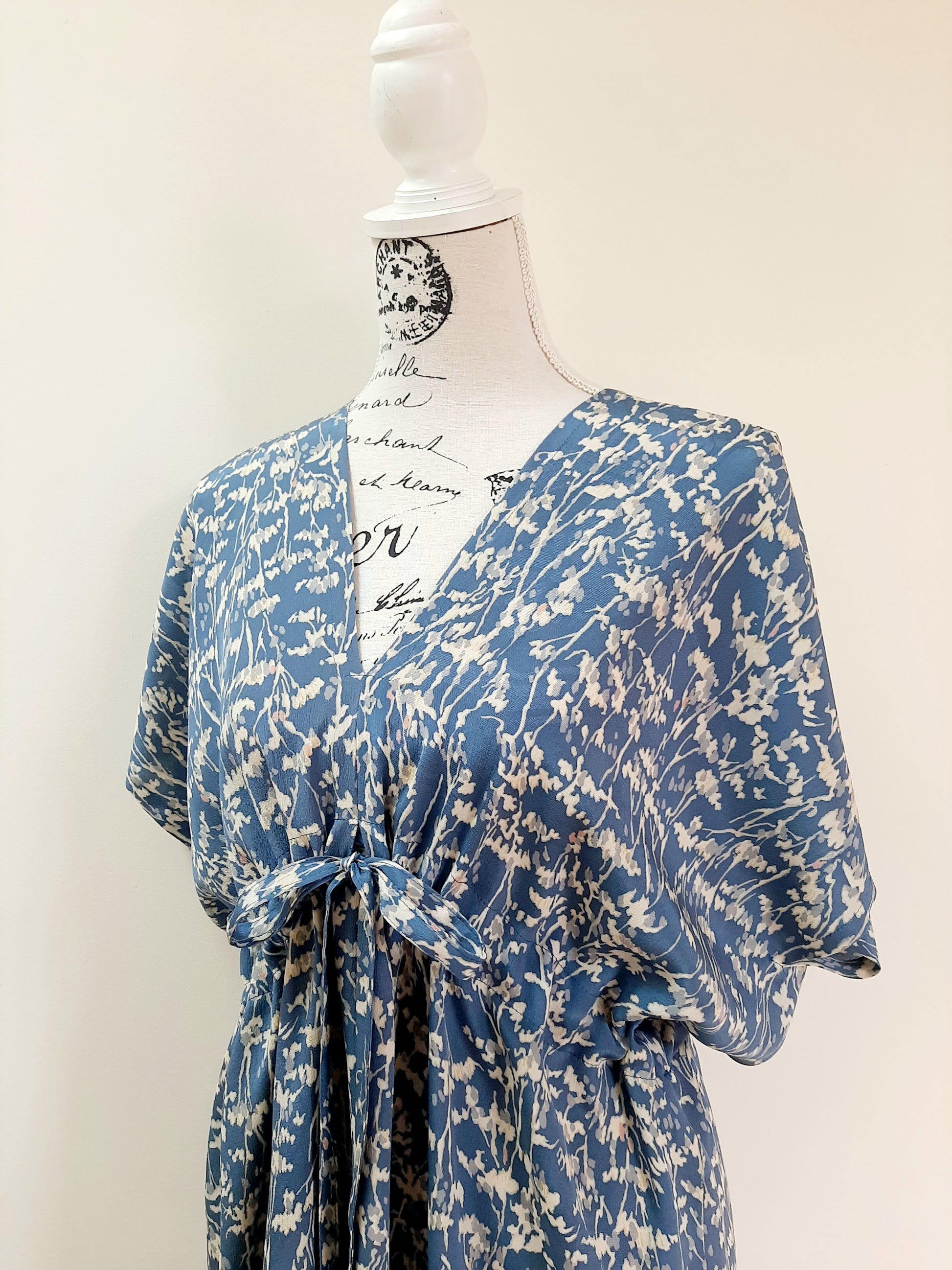 This dress is made from a beautiful silk kimono with lovely botanic pattern. The fabric is dreamingly soft and drapes beautifully.