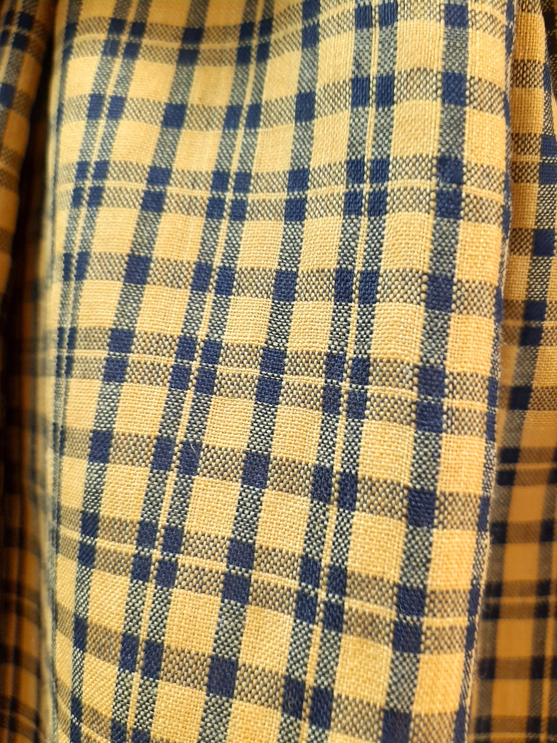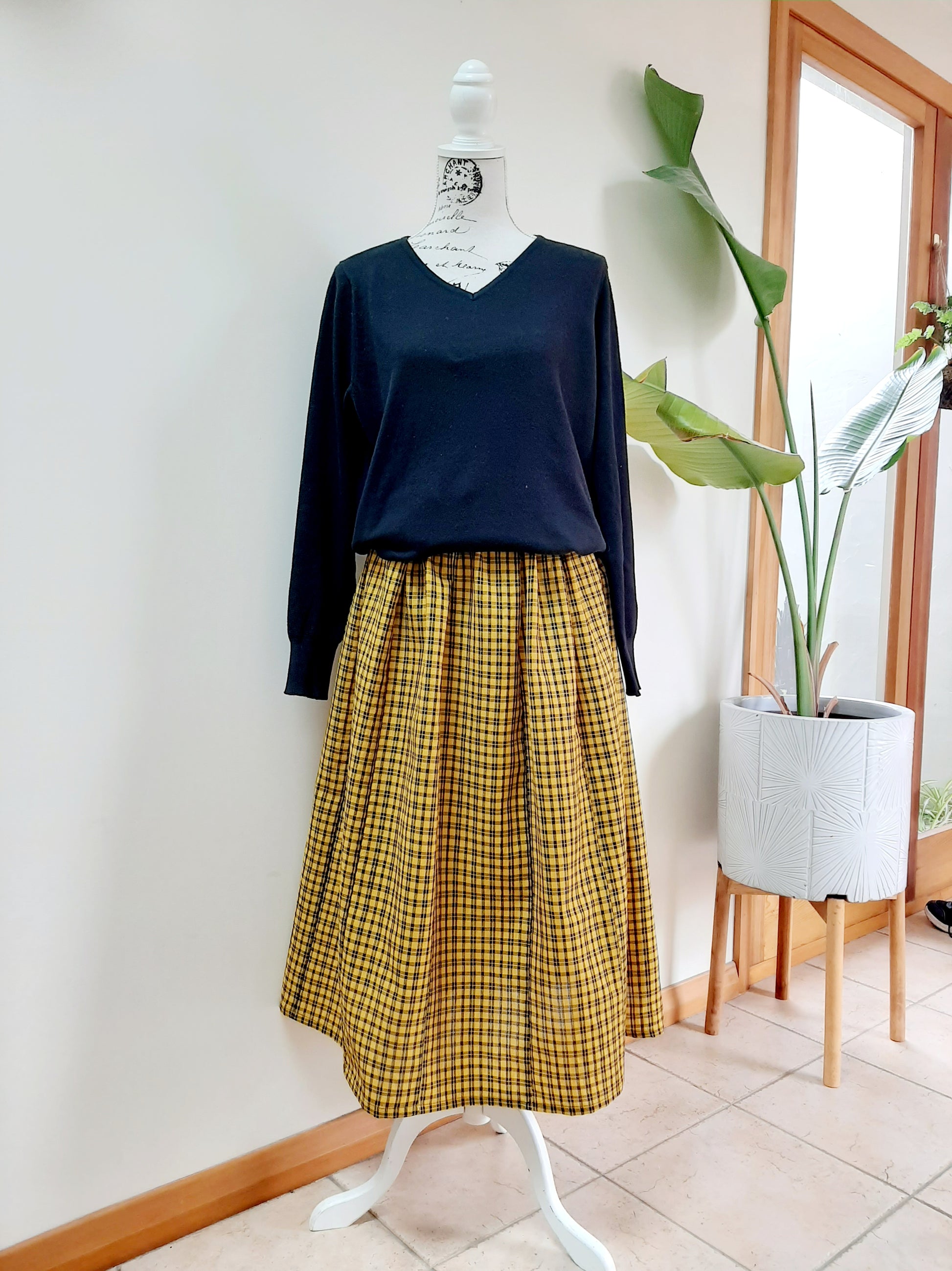 This classy skirt is made from a modern pattern vintage wool kimono. The colour mustard and black is very eye catching. Lovely A line style.